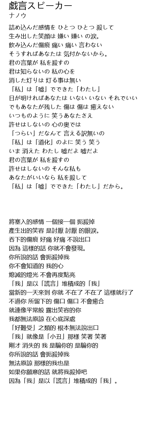 | [03:58.68] | 因為「我」是以「謊言」堆積成的「我」。 |