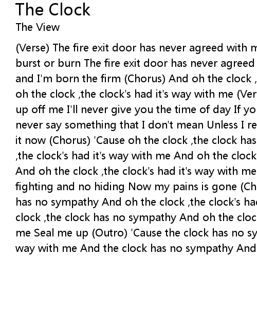 (Verse) The fire exit door has never agreed with me I'm never sure whether to burst or burn The fire exit door has never agreed with me And leave me burning and I'm born the firm (Chorus) And oh the clock ,the clock has no sympathy And oh the clock ,the clock's had it's way with me (Verse) Sway away if you're fed up off me I'll never give you the time of day If you won't get me my way I'll never say something that I don't mean Unless I really mean it, And I really mean it now (Chorus) 'Cause oh the clock ,the clock has no sympathy And oh the clock ,the clock's had it's way with me And oh the clock ,the clock has no sympathy And oh the clock ,the clock's had it's way with me (Bridge x4) There's no fighting and no hiding Now my pains is gone (Chorus) And oh the clock ,the clock has no sympathy And oh the clock ,the clock's had it's way with me And oh the clock ,the clock has no sympathy And oh the clock ,the clock's had it's way with me Seal me up (Outro) 'Cause the clock has no sympathy And the clock's had it's way with me And the clock has no sympathy And the clock's had it's way with me |