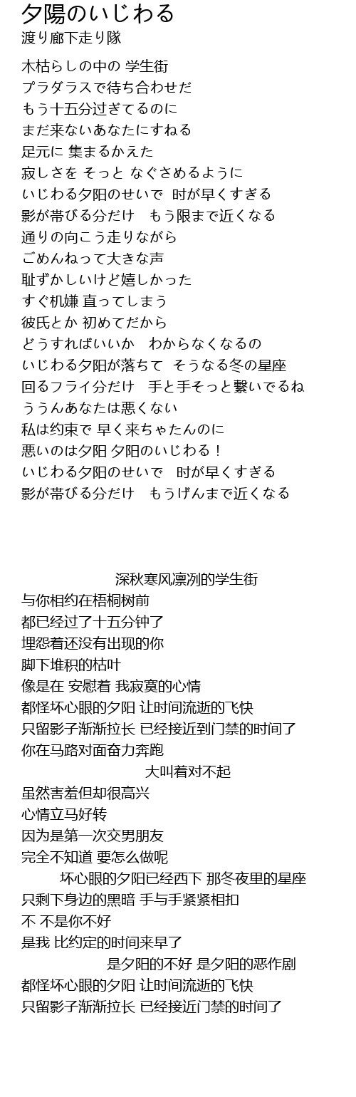| [00:58.32] | いじわる夕阳のせいで 时が早くすぎる |