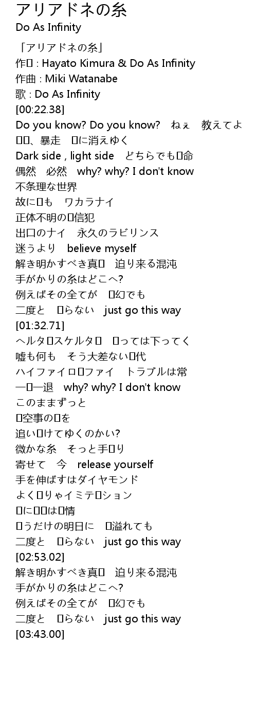 | [00:06.38] | 作�∶Hayato Kimura & Do As Infinity |