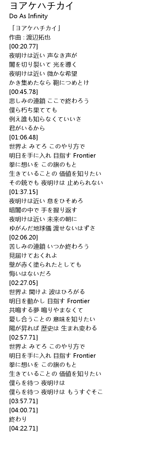 | [00:00.77] | 「ヨアケハチカイ」 |