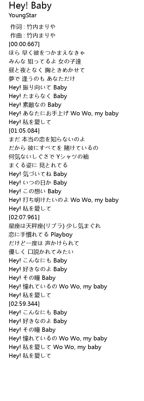 | [01:55.292] | Hey! 打ち明けたいのよ Wo Wo, my baby |