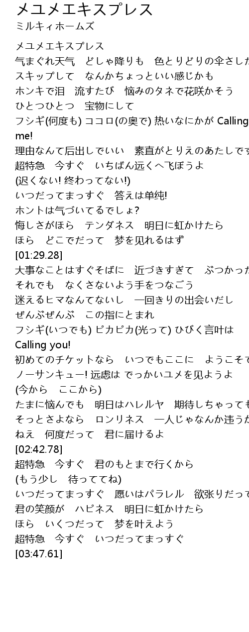 | [01:59.77] | フシギ(いつでも) ピカピカ(光って) ひびく言叶は Calling you! |
