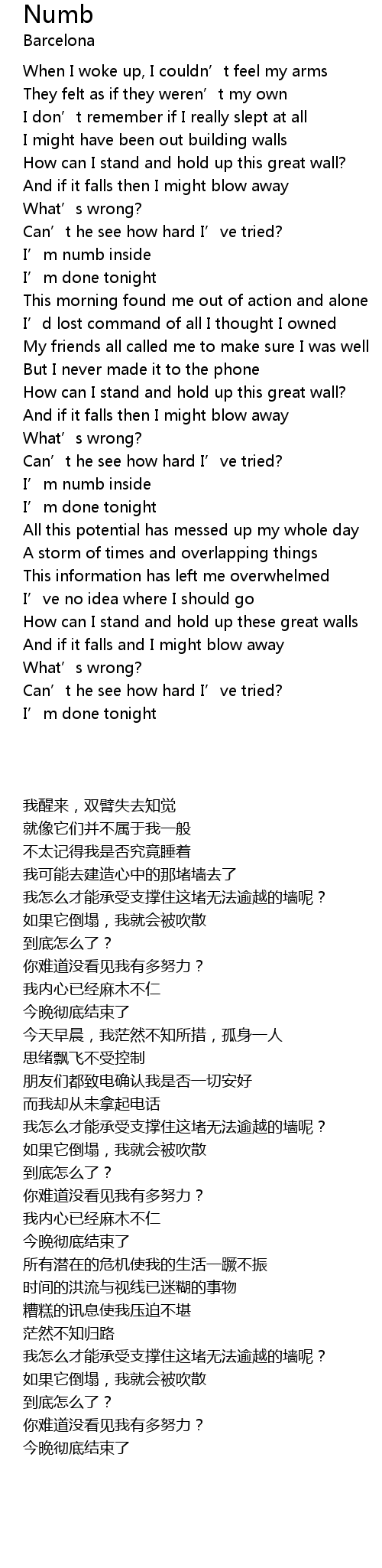 | [00:01.13] | When I woke up, I couldn' t feel my arms |