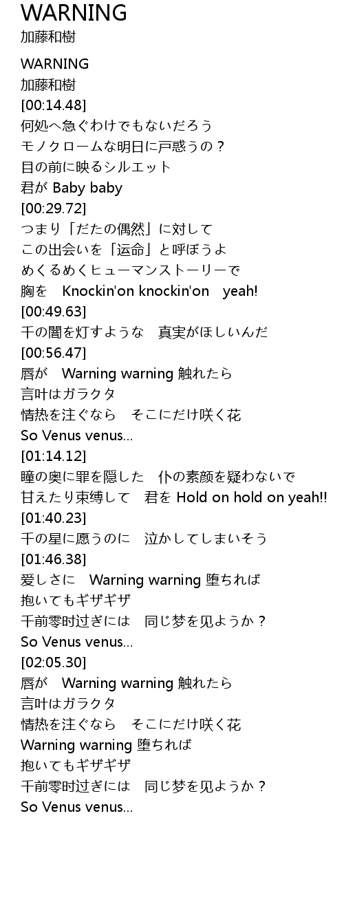 | [01:47.12] | 爱しさに Warning warning 堕ちれば |