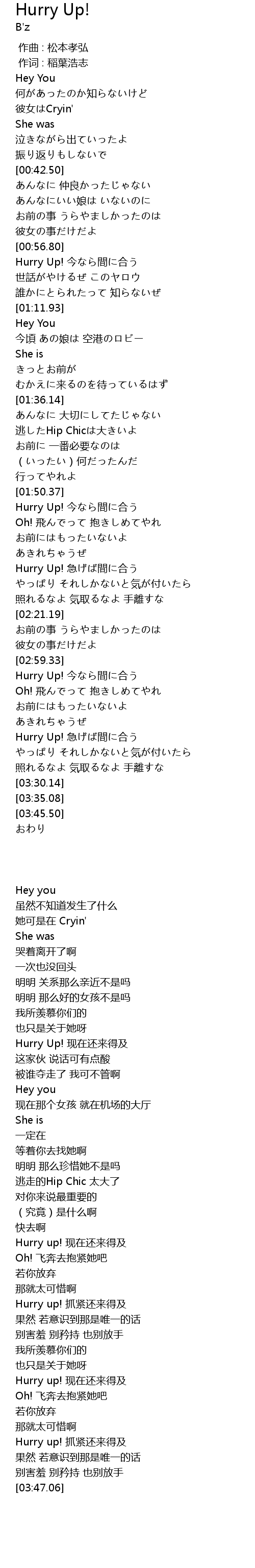 | [03:00.62] | Hurry Up! jīn jiān hé |