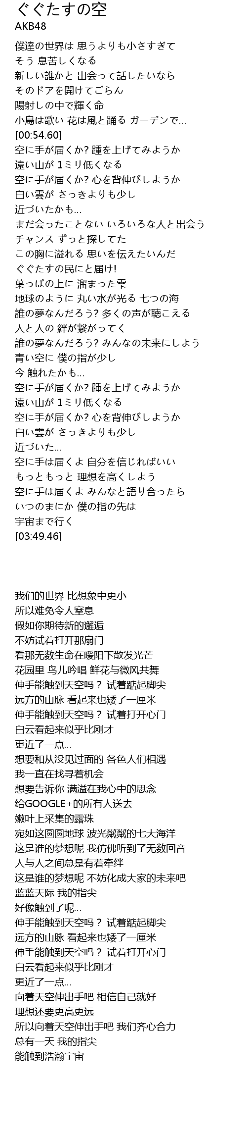 | [00:55.60] | 空に手が届くか? 踵を上げてみようか |