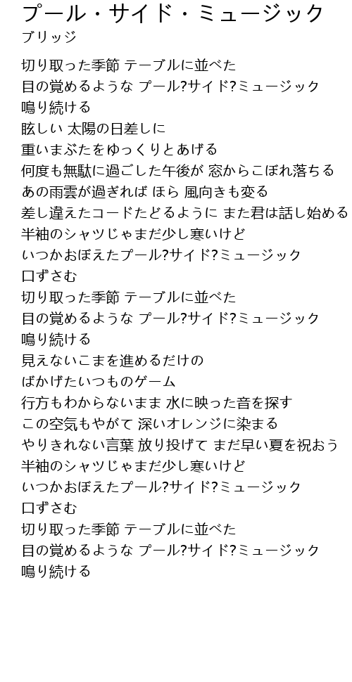 | [03:00.56] | いつかおぼえたプール?サイド?ミュージック 口ずさむ |