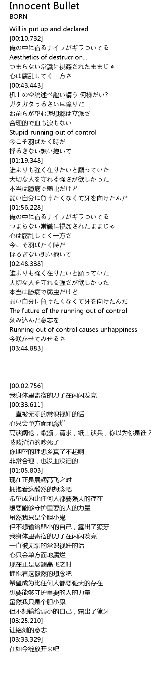 | [00:27.467] | 俺の中に宿るナイフがギラついてる |