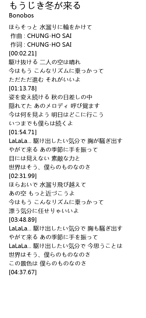 | [04:11.92] | LaLaLa... 駆け出したい気分で 今思うことは |