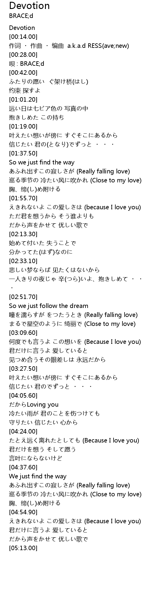 | [00:21.00] | 作词 ・ 作曲 ・ 编曲 a.k.a.d RESS(ave;new) |
