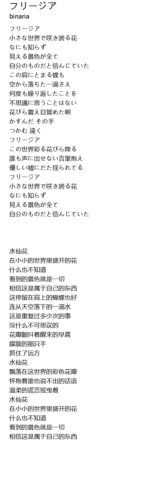 | [01:54.821] | 小さな世界で咲き誇る花 |