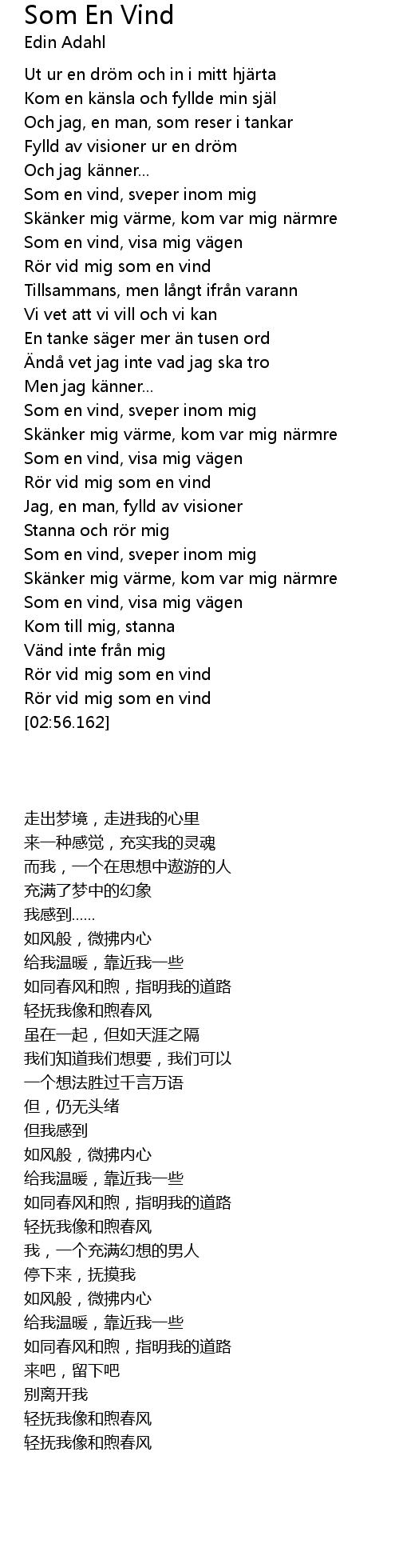 | [00:32.049] | Kom en känsla och fyllde min själ |