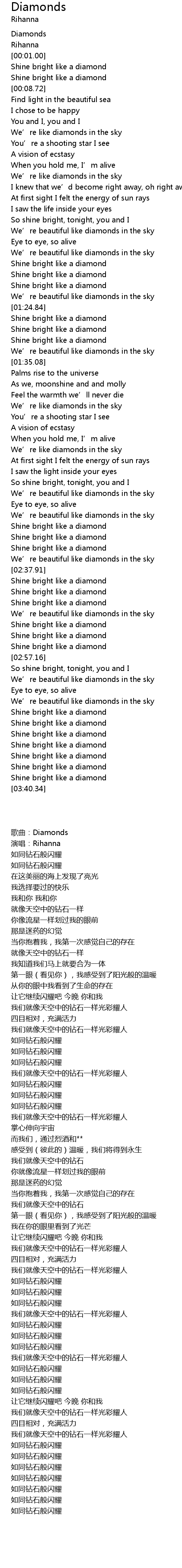 | [00:00.01] | 歌曲:Diamonds |