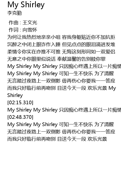 | [02:35.930] | My Shirley My Shirley zhǐ yīn chī xīn zhōng yù shàng suǒ yǐ yī piàn chī qíng |