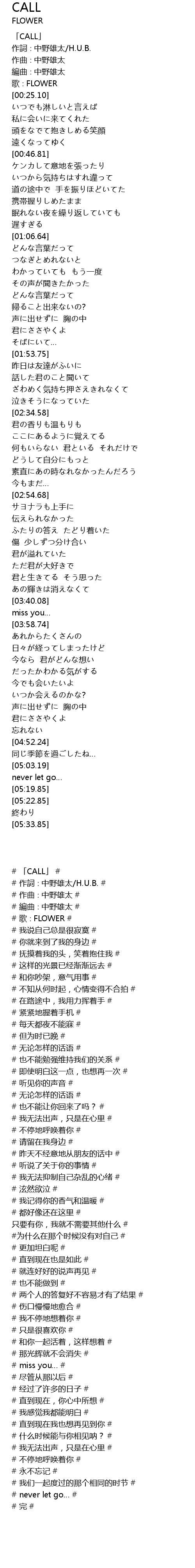 | [00:05.10] | # 作詞∶中野雄太/H.U.B. # |