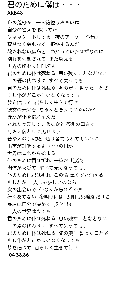 | [04:03.34] | 君のために仆は死ねる 思い残すことなどない |