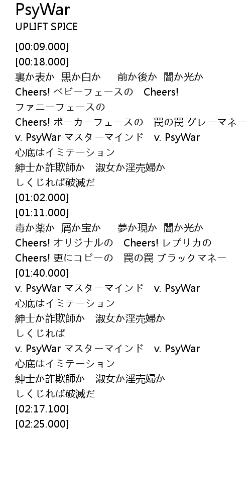 | [01:59.000] | v. PsyWar マスターマインド v. PsyWar 心底はイミテーション |