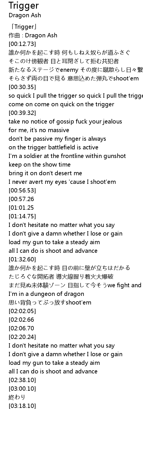 | [01:10.00][01:01.25] | come on come on quick on the trigger |