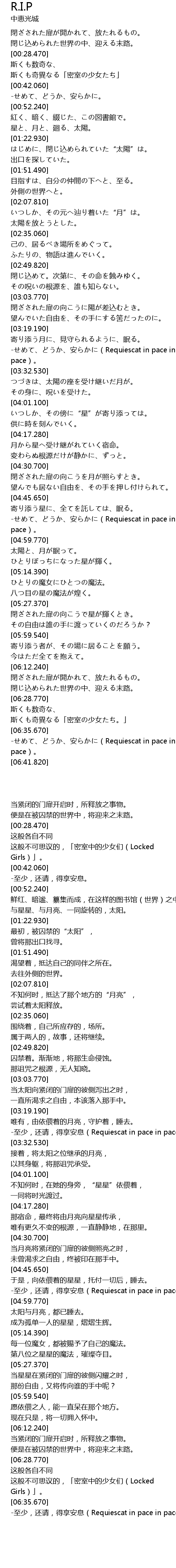 | [04:52.670] | -せめて、どうか、安らかに(Requiescat in pace in pace)。 |