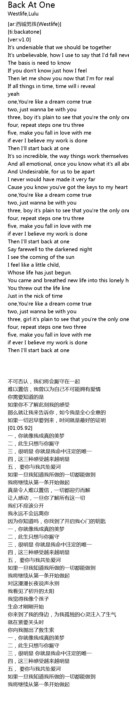 | [01:11.54] | two, just wanna be with you |