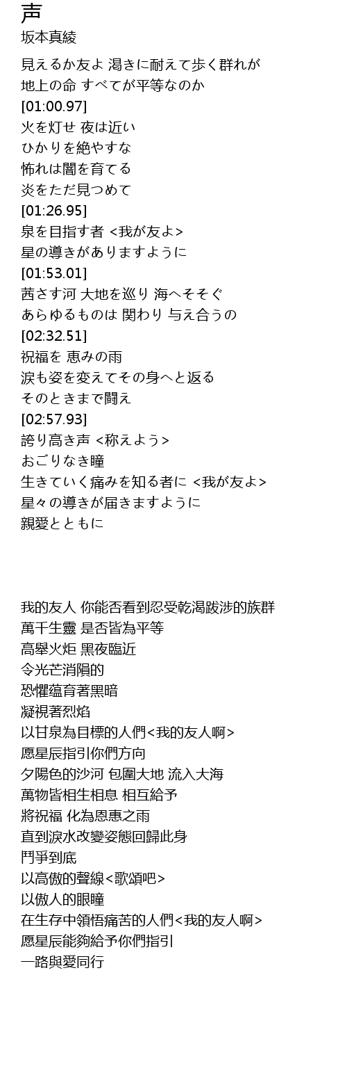 | [03:36.85] | 在生存中領悟痛苦的人們<我的友人啊> |