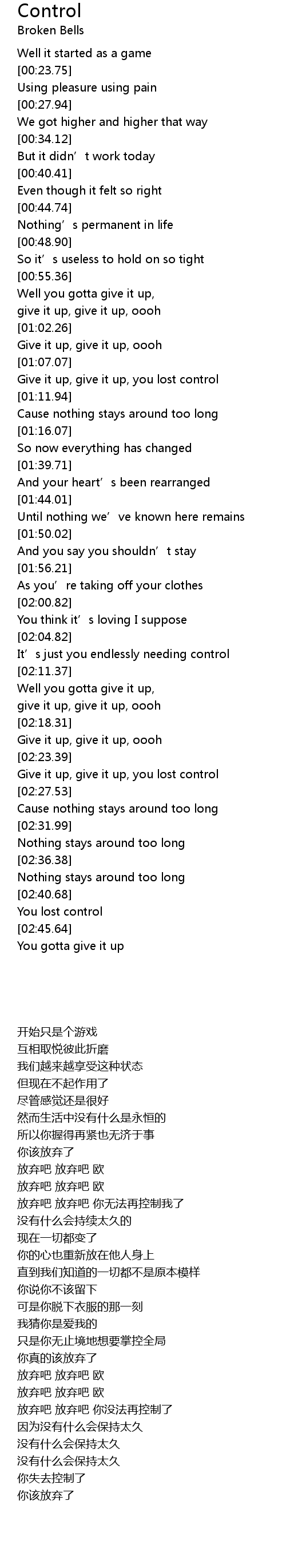 | [02:23.96] | Give it up, give it up, you lost control |