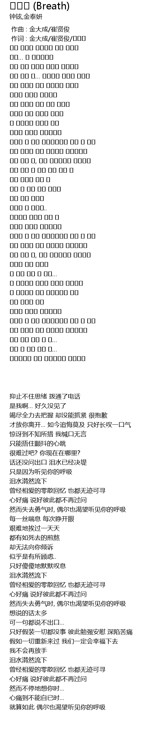 | [01:43.770] | 자신 없을 때, 가끔 숨소리라도 들려주길 |