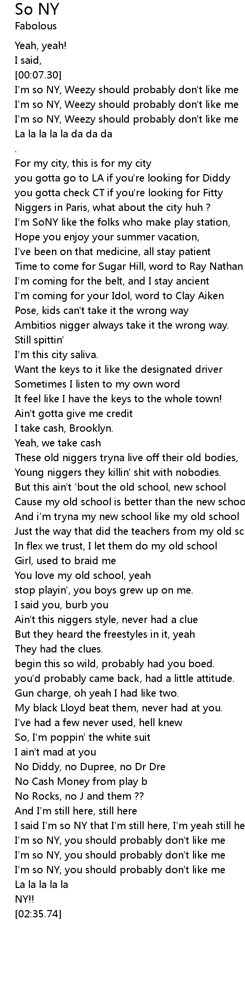 | [02:17.05] | I said I'm so NY that I'm still here, I'm yeah still here |