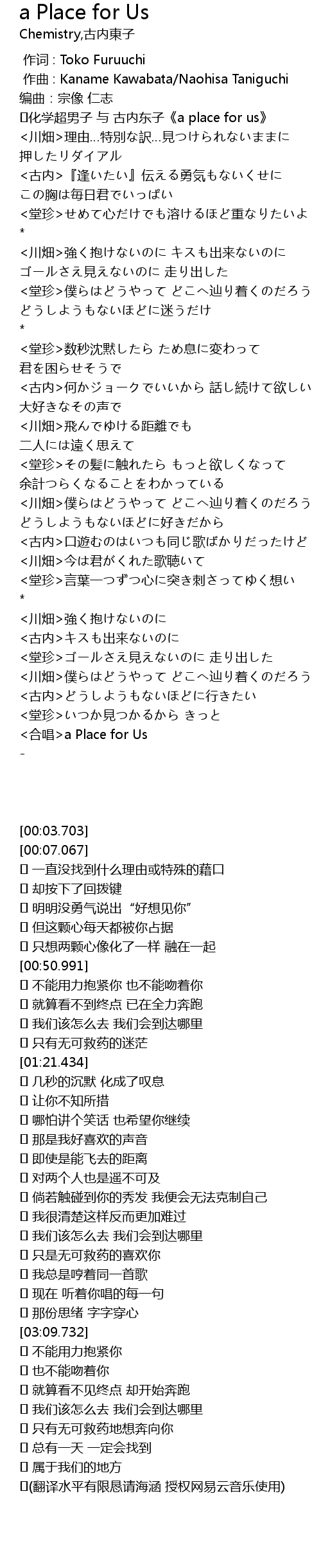 | [00:07.067] | ♪化学超男子 与 古内东子《a place for us》 |