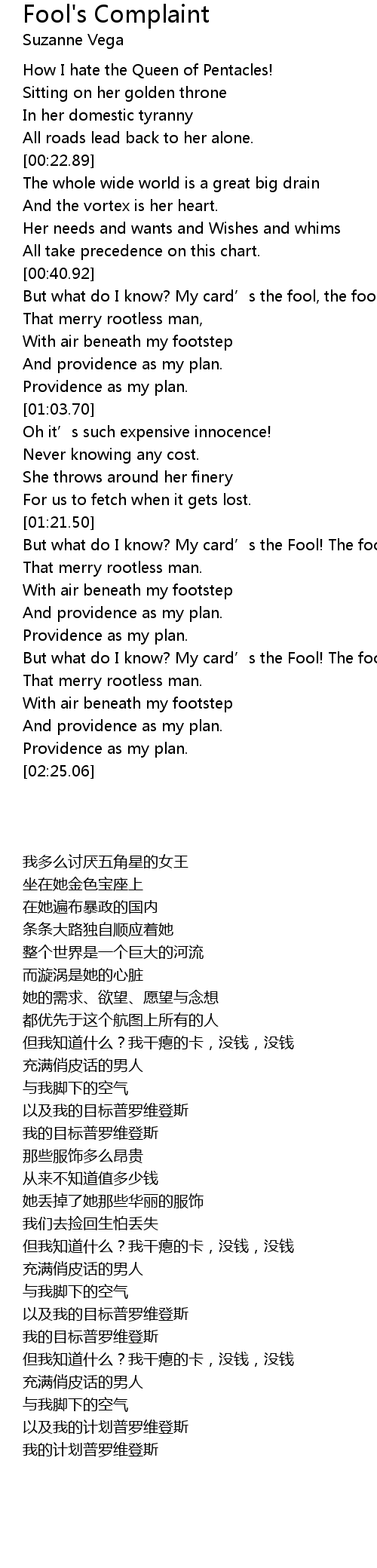 | [02:03.12] | But what do I know? My card' s the Fool! The fool, the fool. |