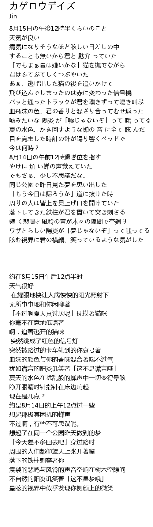 | [02:14.63] | ワザとらしい陽炎が「夢じゃないぞ」って嗤ってる |