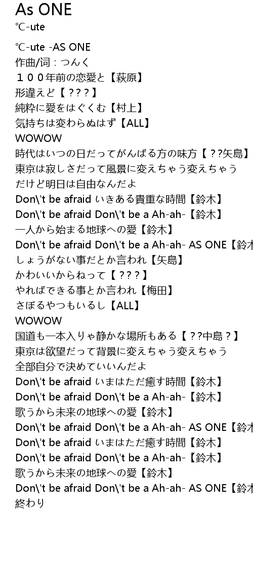 | [03:14.88] | Don\'t be afraid Don\'t be a Ah-ah- AS ONE【鈴木】 |