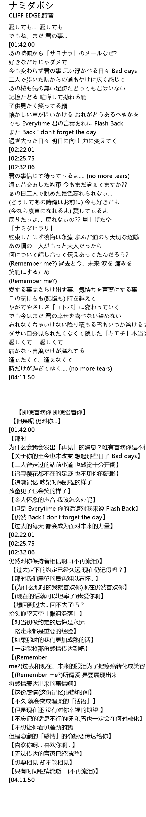 | [01:32.65][02:32.06][03:31.50] | でもね、まだ 君の事信じて待ってぃるよ.... (no more tears) |