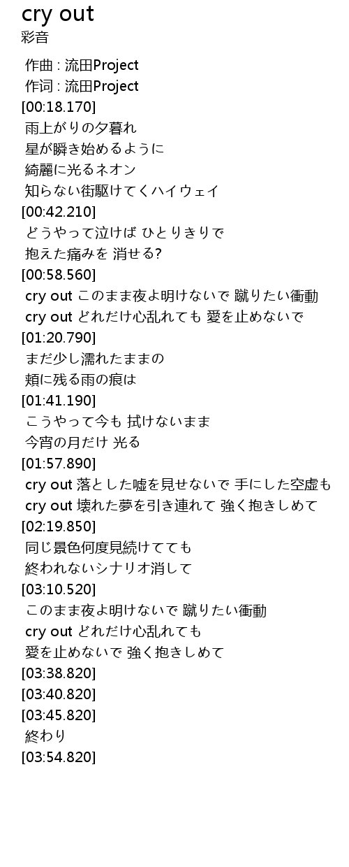 | [01:58.400] | cry out 落とした嘘を見せないで 手にした空虚も |