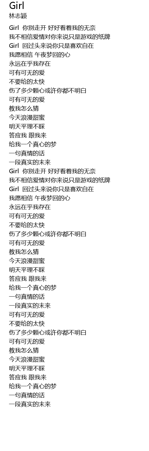 | [00:32.37] | Girl nǐ bié zǒu kāi hǎo hǎo kàn zhe wǒ de wú nài |