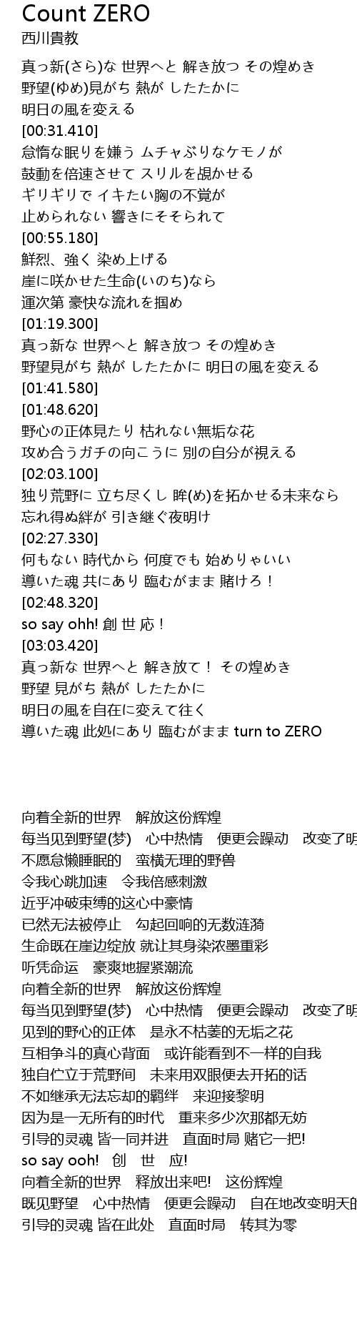 | [03:26.490] | 導いた魂 此処にあり 臨むがまま turn to ZERO |