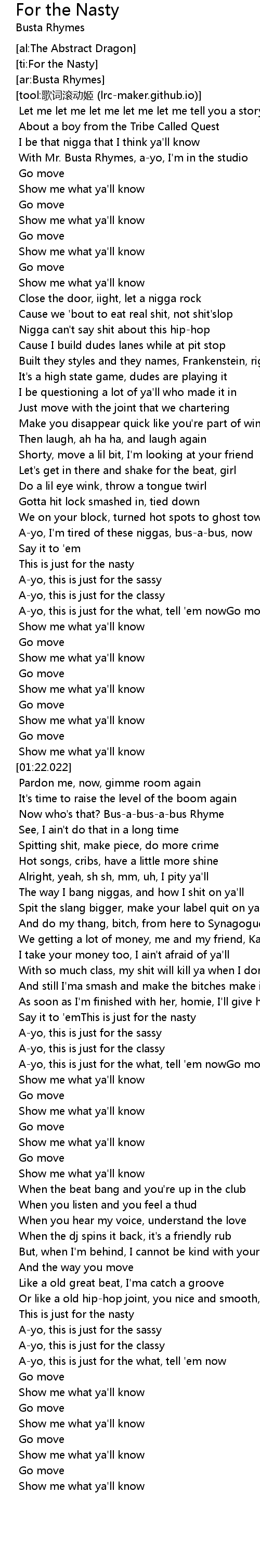 | [00:59.511] | Ayo, I' m tired of these niggas, busabus, now |