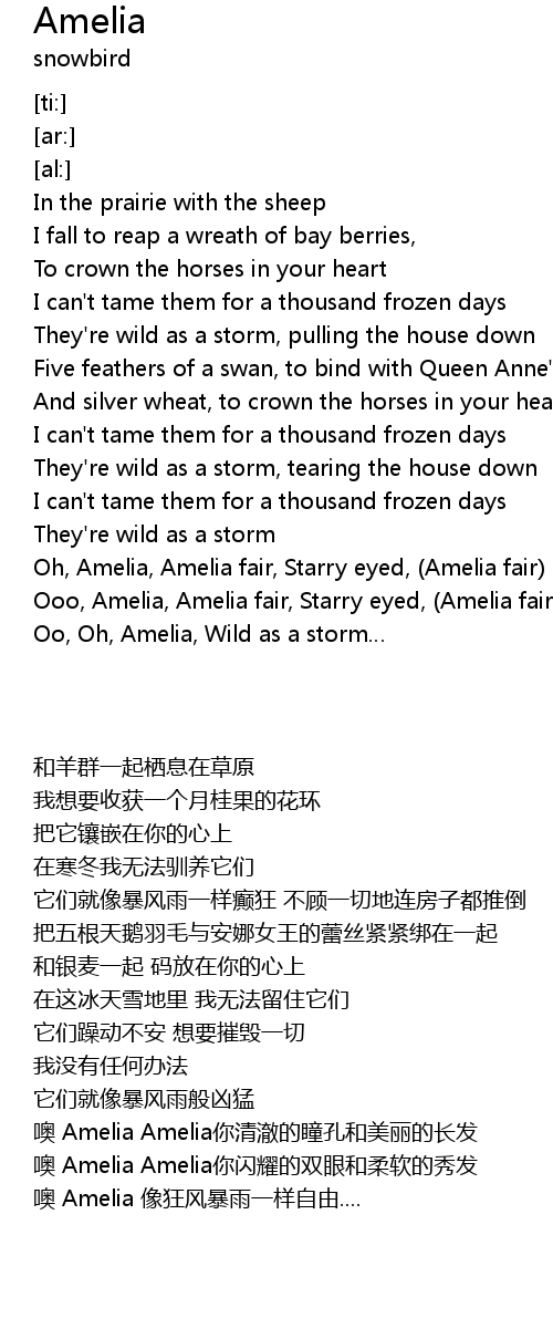 | [02:27.41] | Oo, Oh, Amelia, Wild as a storm |
