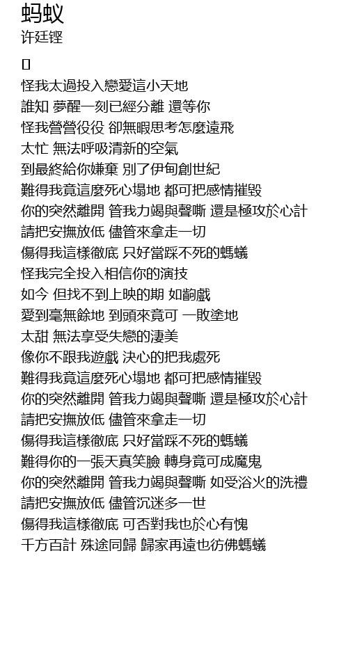 | [01:17.495] | 傷得我這樣徹底 只好當踩不死的螞蟻 |