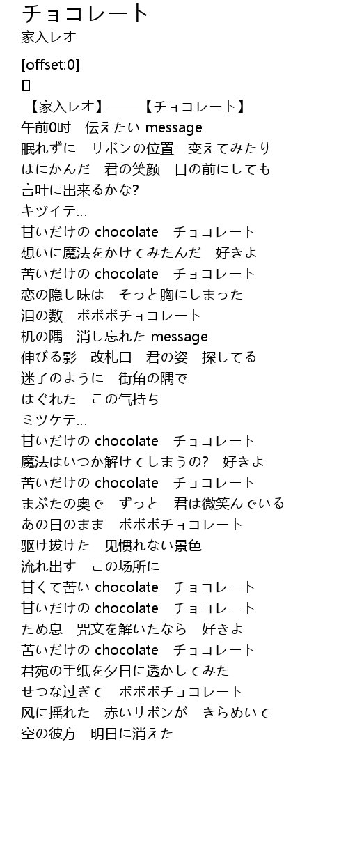 | [00:06.483] | 【家入レオ】——【チョコレート】 |