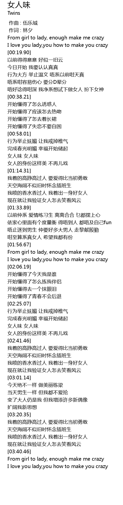 | [01:57.32] | From girl to lady, enough make me crazy |