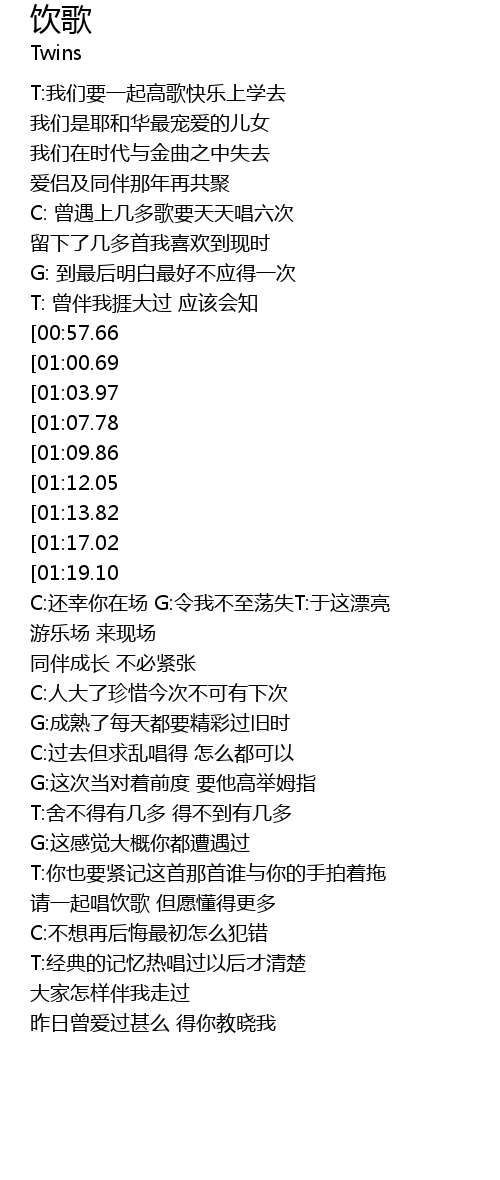 | [02:15.48][00:57.66] | C:一开心唱饮歌 G:不开心唱饮歌 |