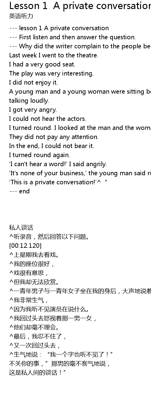 | [00:32.920] | A young man and a young woman were sitting behind me. They were talking loudly. |