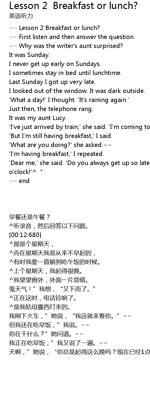 | [00:00.800] | --- Lesson 2 Breakfast or lunch? |