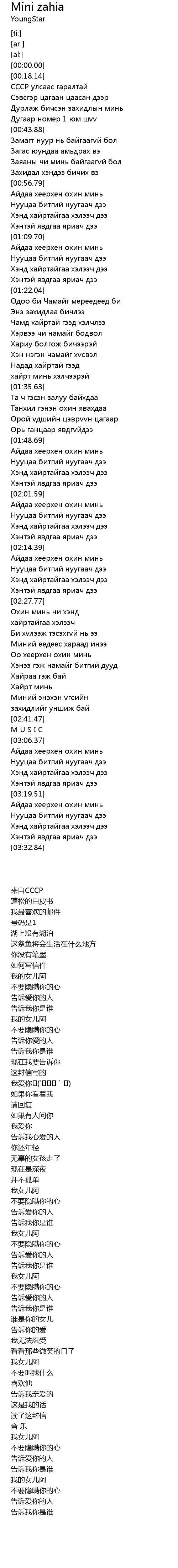 | [02:17.69] | Нууцаа битгий нуугаач дээ |