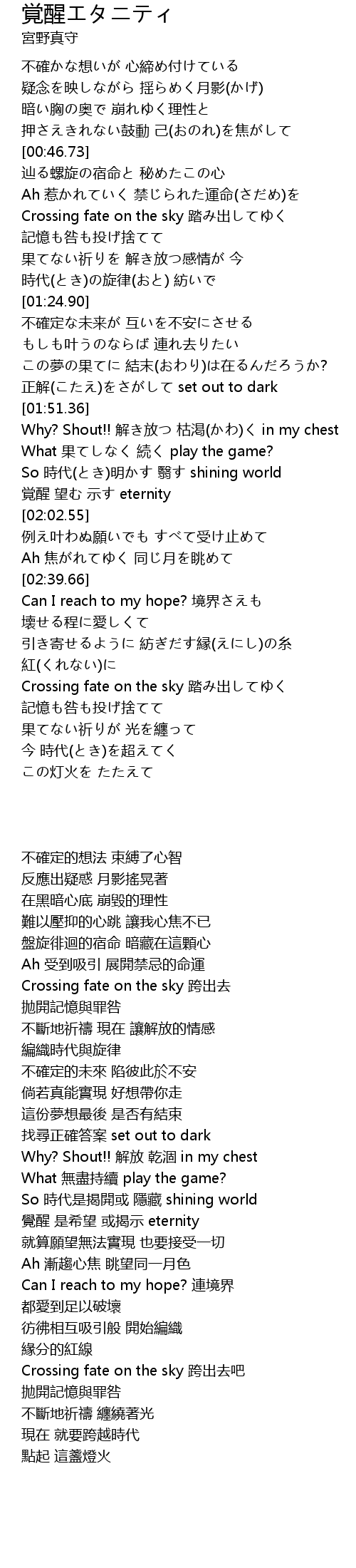 | [02:00.09] | 覚醒 望む 示す eternity |