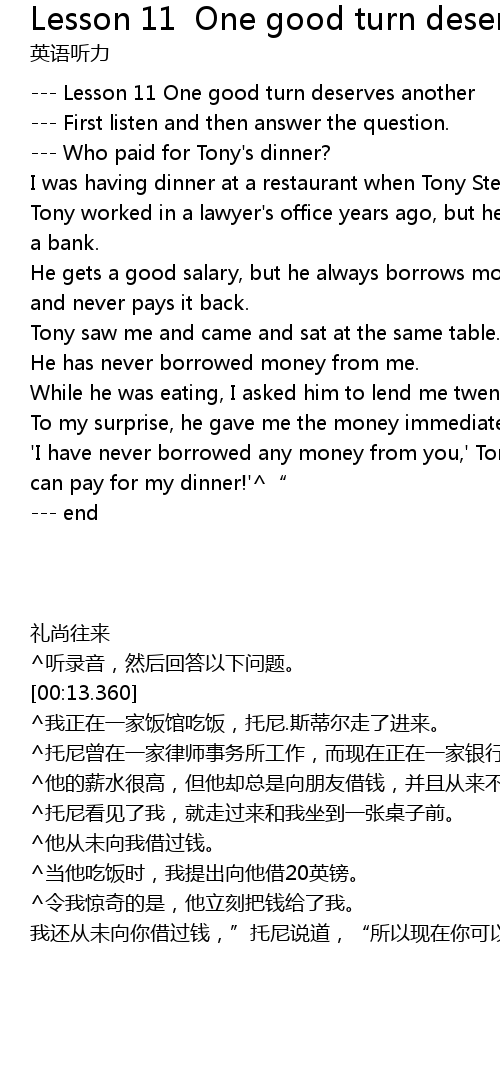 | [00:00.800] | --- Lesson 11 One good turn deserves another |