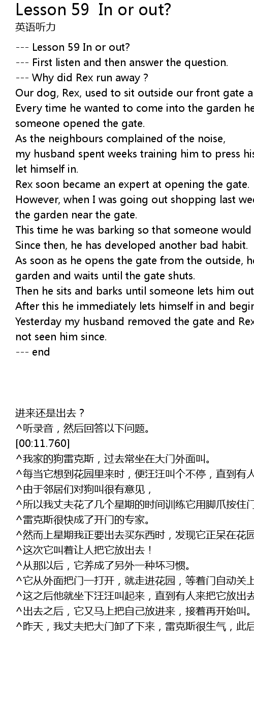 | [01:21.600] | ^昨天,我丈夫把大门卸了下来,雷克斯很生气,此后我们便再也没有见到它。 |