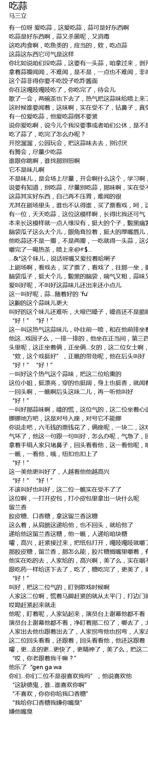 | [02:23.73] | 他吃蒜还不是一瓣,不是两瓣,一吃就得一头蒜,这么大个大头,一头蒜,都吃了 |